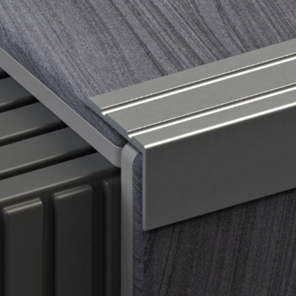 Szögletes, utólagosan rögzíthető, öntapadós ezüst, vagy pezsgő színű eloxált alumínium lépcső profil.